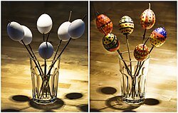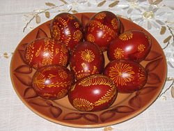 Une technique populaire de décoration des œufs de Pâques, appelée « pissanka » (en polonais: Œuf de Pâquesen ukrainien : писанка), associe l’usage de la teinture et de la cire.