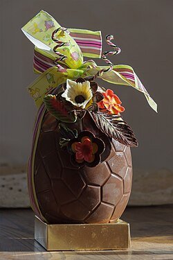 Cette tradition de conserver les œufs pondus pendant le carême puis de les décorer avant de les offrir à Pâques se développe surtout dans les cours royales avant de se diffuser dans les familles bourgeoises. Au cours de la première révolution industrielle, se met en place un processus qui associe cadeaux et commerce, les Allemands ayant l’idée à la fin du Xixe siècle de remplacer les œufs de poule par des œufs au chocolat[14].