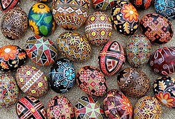 Une technique populaire de décoration des œufs de Pâques, appelée « pissanka » (en polonais: Œuf de Pâquesen ukrainien : писанка), associe l’usage de la teinture et de la cire.