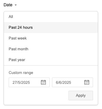 • freshness – Contrôle l'âge ou la plage de dates des résultats de recherche. Ceux-ci peuvent être atteints en utilisant le filter paramètre dans notre API avec les valeurs suivantes :