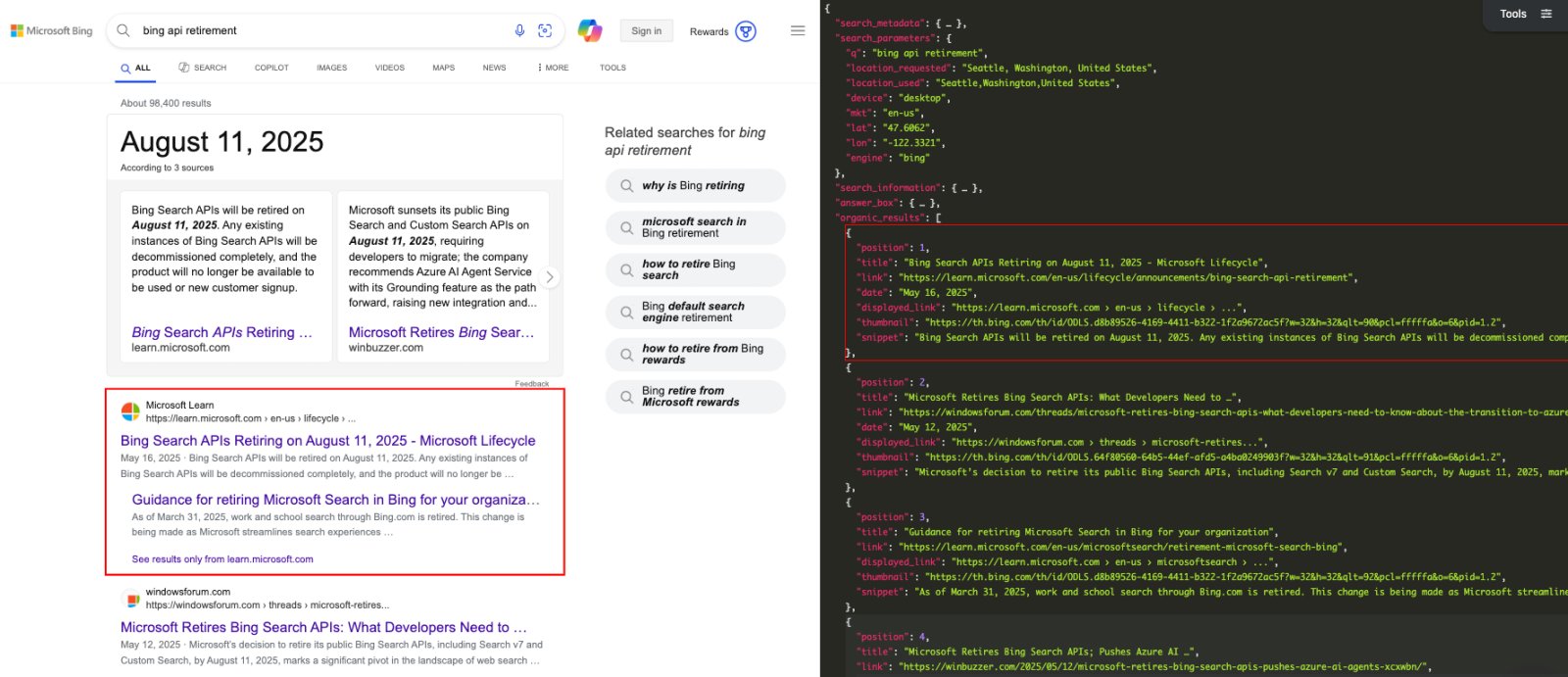 Chez SerpApi, nous fournissons notre propre API de recherche Bing qui peut être facilement intégrée pour minimiser les interruptions de votre service une fois les API officielles retirées.