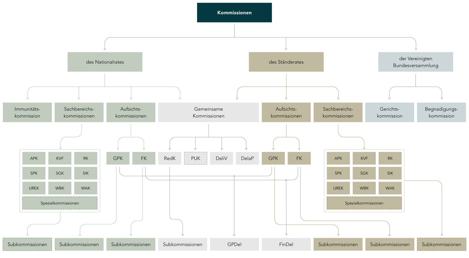 Sowohl der Nationalrat, ainsi que le Ständerat et la Vereinigte Bundesversammlung verfügen über Kommissionen. Der National- und der Ständerat haben je neun Sachbereichs- und zwei Aufsichtskommissionen, der Nationalrat hat darüber hinaus eine Immunitätskommission (IK) (Art. 10 GRN et Art. 7 GRS). Die Vereinigte Bundesversammlung hat eine Gerichtskommission (GK) und eine Begnadigungskommission (BeK) (Art. 39 Abs. 4, 40 et 40un ParlG).
