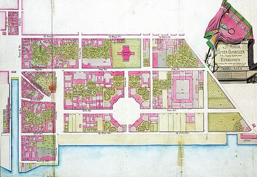 Frederik v Udnævnte Adam Gottlob Moltke Som Hovedansvarlig pour Anlæggelsen. Ansvaret pour le det arkitektoniske og byplanmæssige arbejde blev givet til nicolai eigtved. På Tomten Lå Kun Restherne af Det Brændte Slot Sophie Amalienborg og en Stor Barokhave, der Hørte Til Slottet.