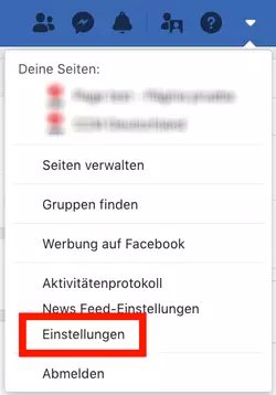 Connectez-vous si vous êtes normalement connecté à votre compte Facebook. Rufen Sie das Menü auf, indem Sie oben rechts auf the kleine Symbole Dreieck cliquez et regardez sie Instellungen aus: