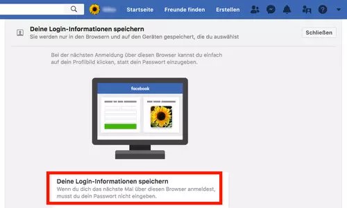 Si vous êtes ici Deine Login-Informationen speichern Cliquez, mais si vous êtes à proximité de Mal, lorsque vous êtes Facebook sur votre propre appareil et avec votre propre navigateur, vous n'avez pas besoin de vous connecter davantage :