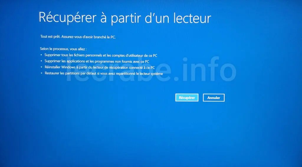 - Windows est entièrement réinstallé à partir des fichiers système présents sur le lecteur de récupération (et non à partir de ceux du le disque système) ;