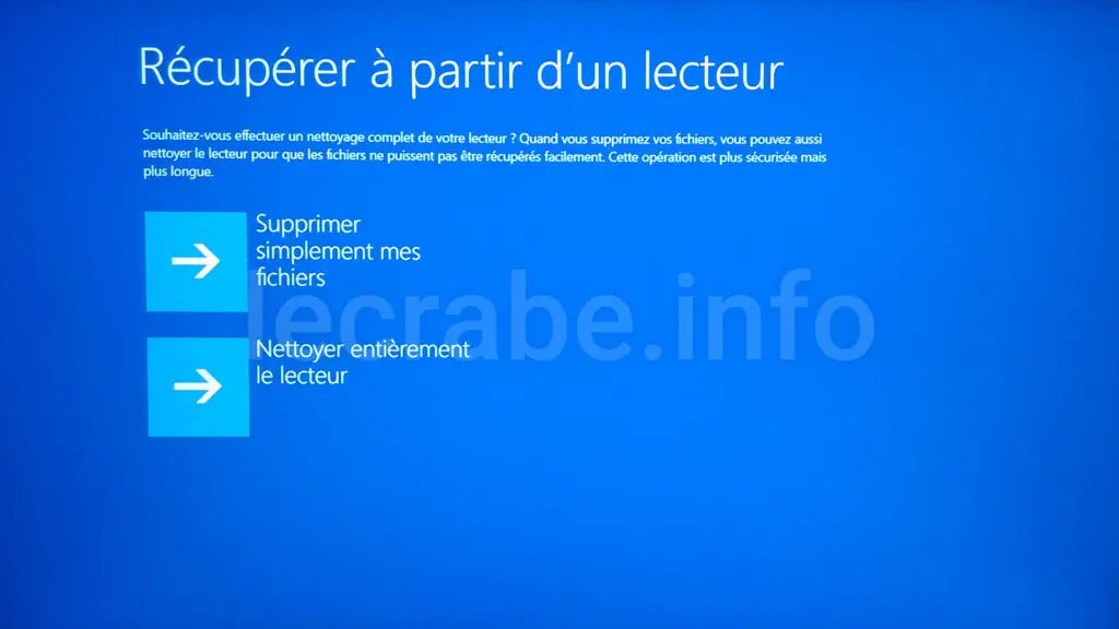 - Nettoyer entièrement le lecteur : effectue un effacement complet du lecteur, tous les fichiers seront effacés définitivement. Il sera (quasiment) impossible de les récupérer. C’est la solution la plus sûre si vous avez des données sensibles mais sachez qu’elle est assez longue (comptez plusieurs heures selon la taille du lecteur).