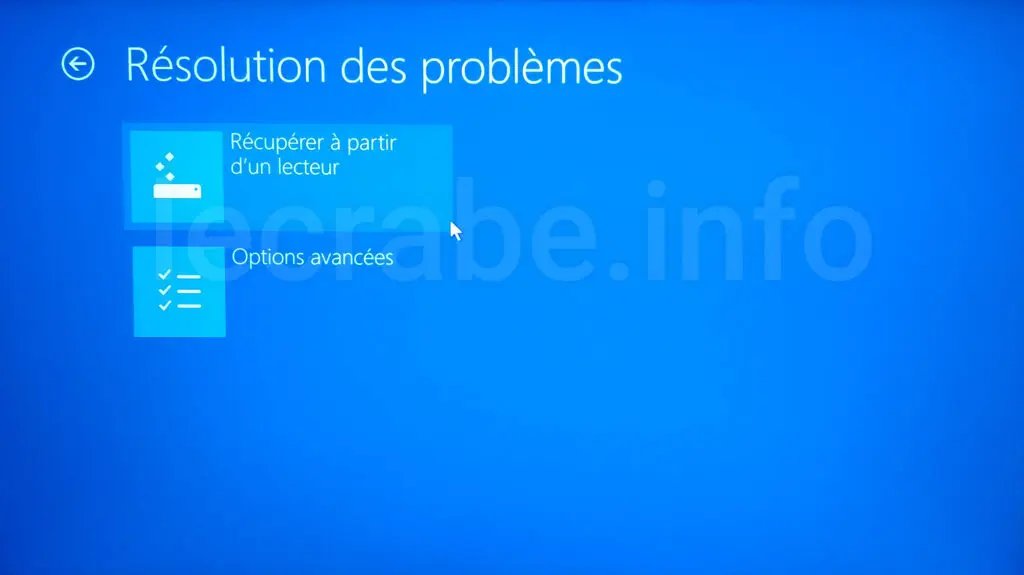 - Solution n°2 : démarrer votre PC à partir du lecteur de récupération USB et choisir l’option Récupérer à partir d’un lecteur.