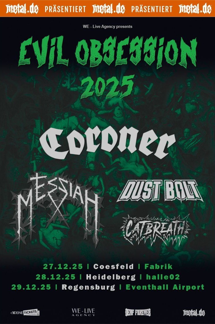 Die Evil Obsession Tour 2025 Geht in Die Nächste Runde und Bietet Erneut Ende des Jahres Ein Hochkarätiges alignement. Den Abend Eröffnen Die Kieler Crossover-Thrasher Catbrebreh Gefolgt von Den Landsberger Thrashern von Dust Bolt. MIT der Schweizer Doppelpack Messie und Coroner Verspricht Jeder Abend Einen Hochkarätigen Ausklang.